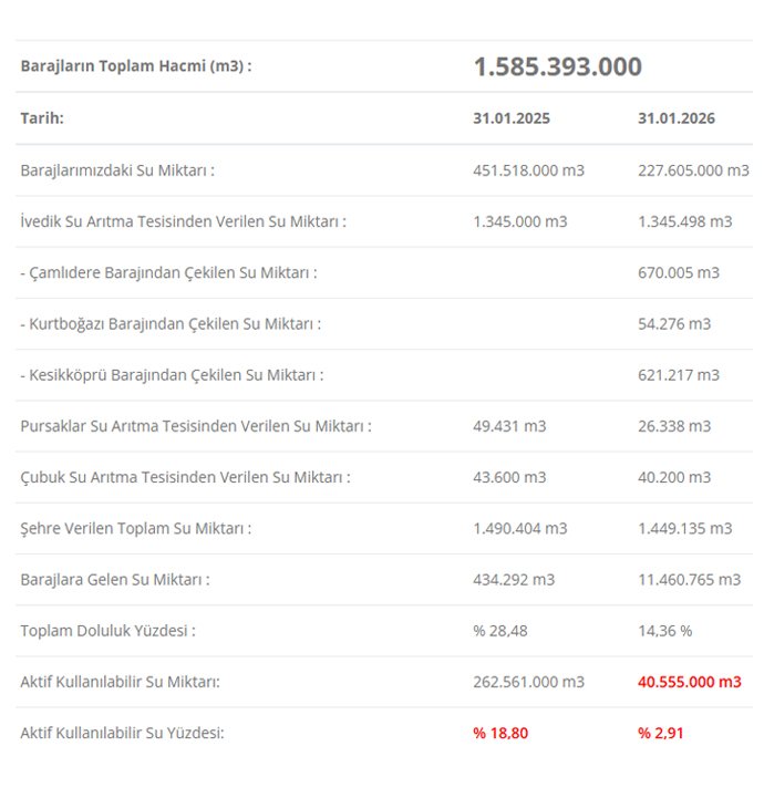 Verilere göre aktif kullanılabilir su miktarı da ciddi biçimde azaldı. 2025’te 262 milyon 561 bin metreküp olan aktif su miktarı, 2026’da 40 milyon 555 bin metreküpe geriledi. Bu düşüşle birlikte aktif kullanılabilir su oranı yüzde 18,80’den yüzde 2,91’e indi.