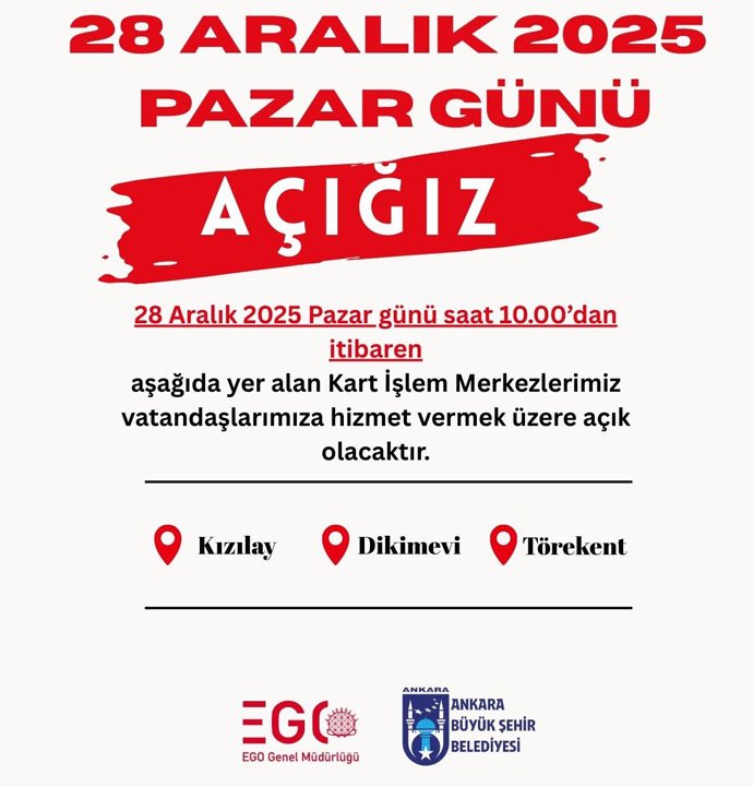 Yapılan duyuruya göre Kızılay, Dikimevi ve Törekent’te bulunan Kart İşlem Merkezleri, 28 Aralık Pazar günü saat 10.00’dan itibaren açık olacak. Vatandaşların işlemlerini belirtilen merkezlerden gerçekleştirebileceği bildirildi.