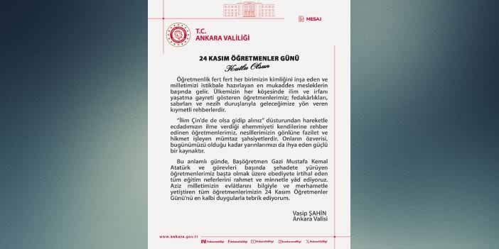 Ankara Valisi Vasip Şahin, 24 Kasım Öğretmenler Günü nedeniyle bir mesaj yayımlayarak, öğretmenlerin hem bireylerin hem de milletin geleceğini inşa eden en önemli rehberler olduğunu söyledi.