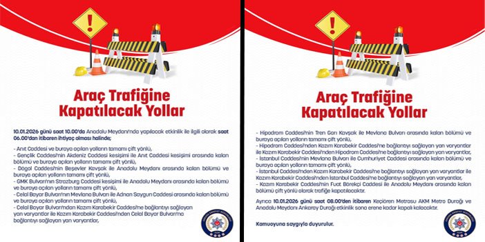 Ankara’da 10 Ocak’ta yapılacak etkinlik nedeniyle birçok ana arter araç trafiğine kapatılacak. Emniyet, sabah erken saatlerden itibaren uygulanacak tedbirler için sürücüleri uyardı, metro ve Ankaray durakları da geçici olarak kapalı olacak.