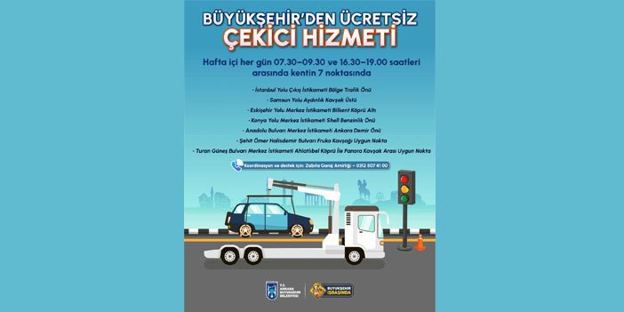 Ankara Büyükşehir Belediyesi, şehir trafiğinde sıkça yaşanan araç arızaları nedeniyle oluşan yoğunluğu azaltmak için yeni bir uygulamayı hayata geçirdi. Ücretsiz çekici hizmeti, belirlenen noktalarda yoğun saatlerde hızlı müdahale sağlayacak.