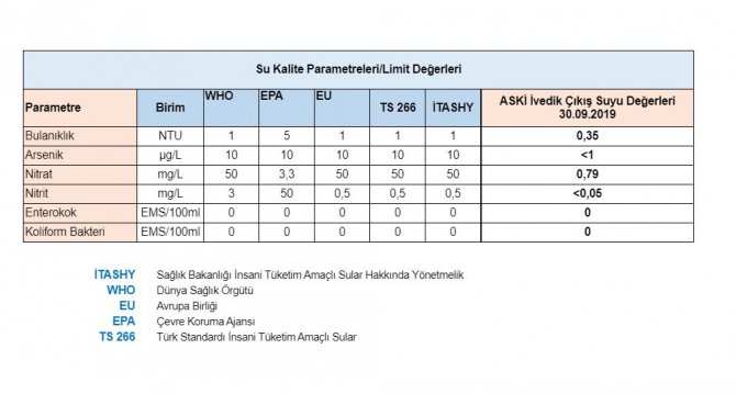 Eylül ayı süresince yapılan fiziksel, kimyasal ve bakteriyolojik analizler sonucunda ASKİ tarafından şehir şebekesine verilen içme ve kullanma suyunun dünya standartlarına uygun olduğu belirtildi.