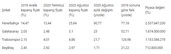 Borsada işlem gören 4 spor şirketinin Aralık 2019, Temmuz ve Ağustos 2020 kapanış fiyatı, değişimi, 2019 sonuna göre farkı ve piyasa değerleri şöyle: