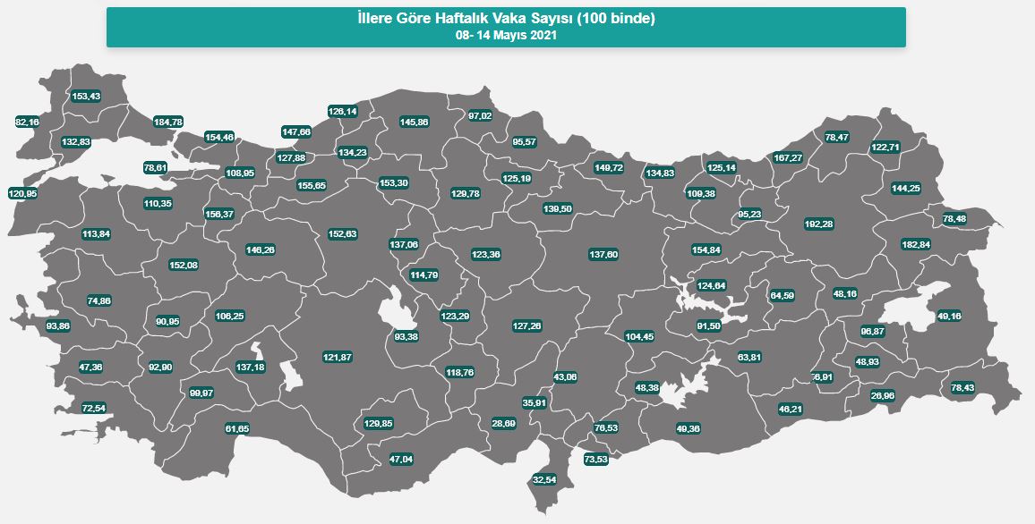 Sağlık Bakanlığı'nın resmi internet sitesi üzerinden her 100 bin kişide illere göre haftalık (29 Mayıs - 4 Haziran) Kovid-19 vaka sayılarını gösteren Türkiye haritada son durum şöyle: