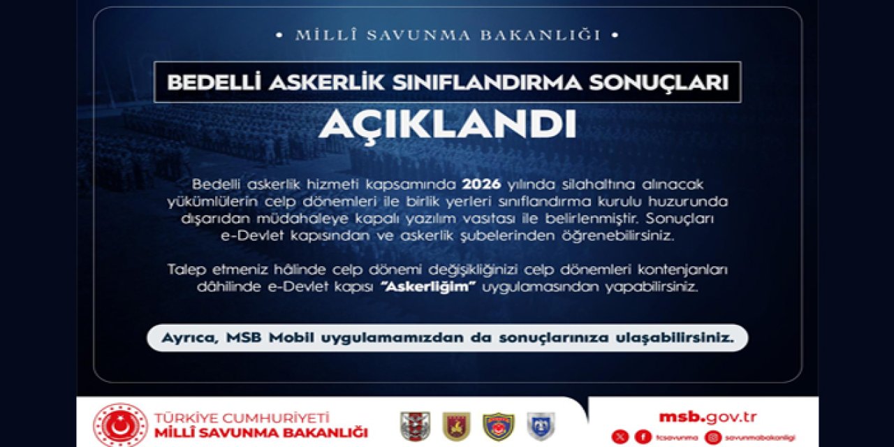 Milli Savunma Bakanlığı (MSB), bedelli askerlik yapacak yükümlüler için beklenen duyuruyu yaptı. 2026 yılı kapsamında celp dönemleri ve birlik yerleri netleşirken, sınıflandırma sonuçları erişime açıldı.