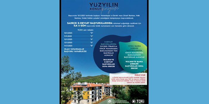 Cumhuriyet tarihinin en büyük sosyal konut hamlesi Yüzyılın Konut Projesi, 81 ilde 500 bin konutla dar gelirli vatandaşları ev sahibi yapmayı hedefliyor. Başvurular 10 Kasım’da başlayacak ve 19 Aralık’a kadar devam edecek.